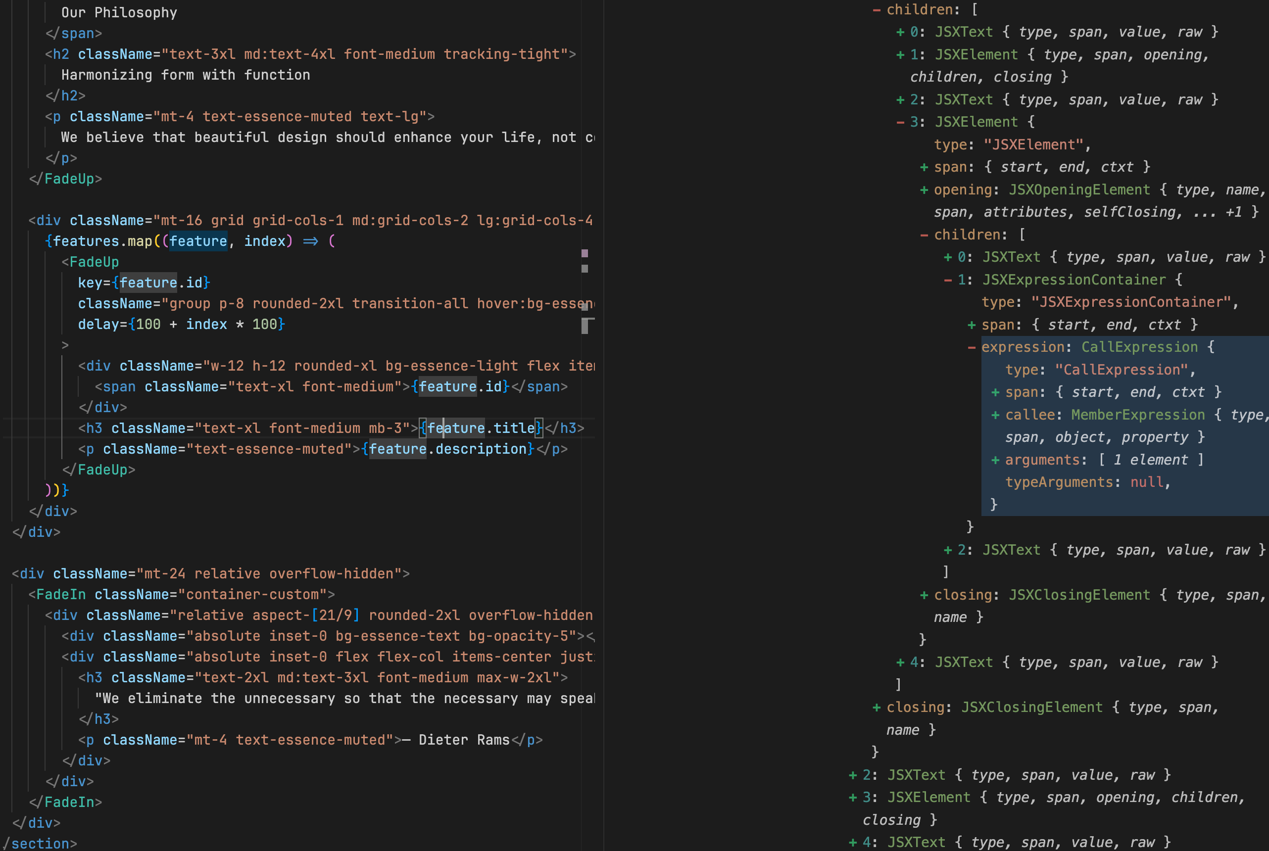 We sync the project's code entirely into the browser, representing it as an Abstract Syntax Tree (AST), essentially an interactive, live data structure reflecting the entire application structure. Babel and SWC are both great libraries for this. There's a ton of cool things we can do once we have the AST client-side. For example: